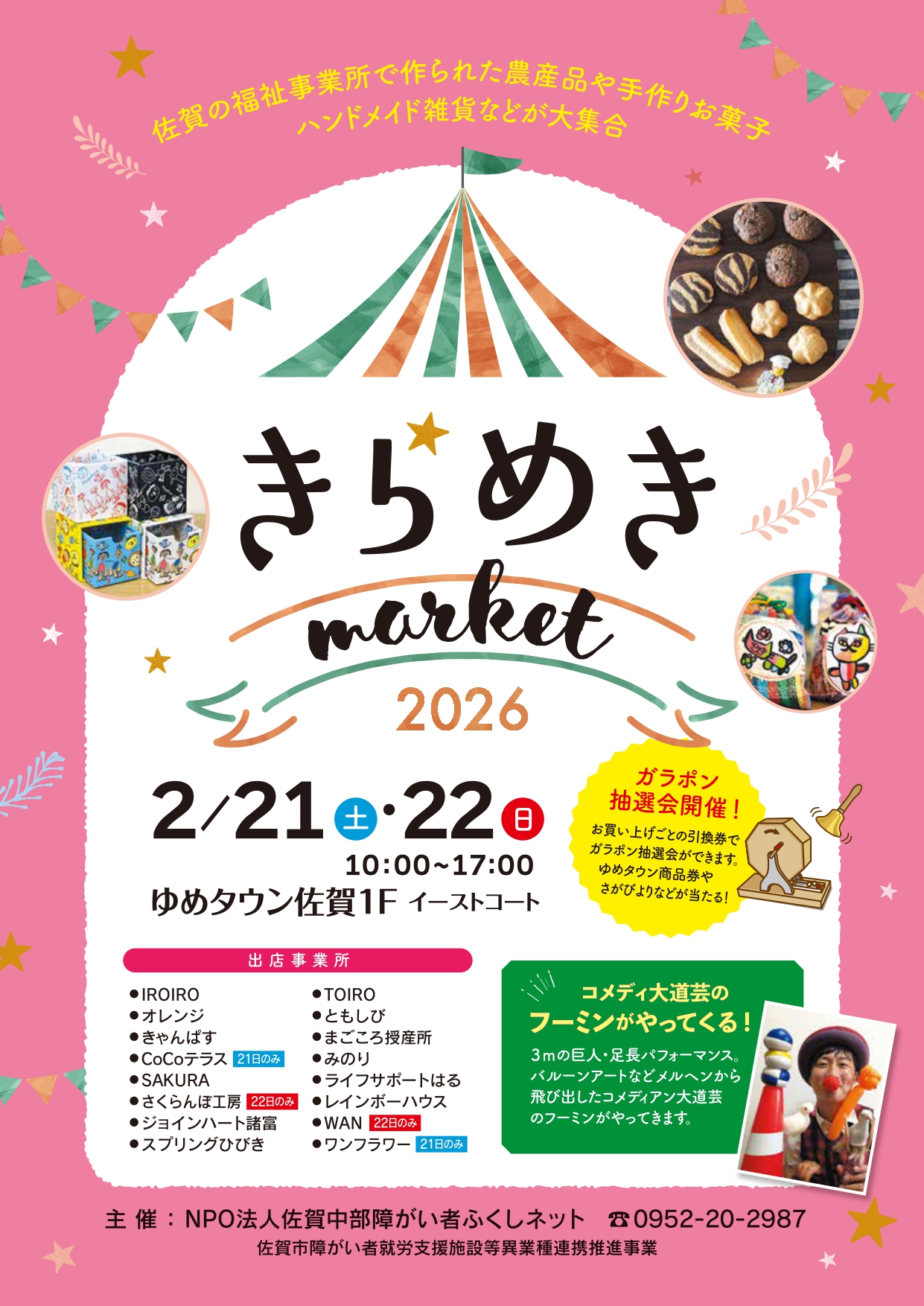 こんにちは佐賀中部障がい者ふくしネットです。今年も、ゆめタウン佐賀様1Fイーストコートできらめきマーケット開催いたします。福祉事業所で作られた農産物や手作りお菓子ハンドメイド雑貨などが大集合!!豪華景品の当たるガラポン抽選会やコメディ大道芸のフーミン…